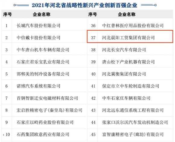 河北晨陽工貿集團榮膺“2021年河北省戰略性新興產業創新企業百強”