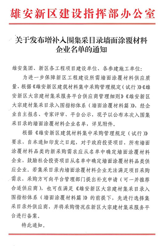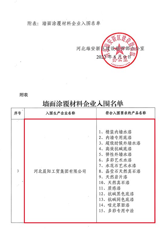 2022年8月9日,雄安新區(qū)建設(shè)指揮部辦公室發(fā)布了《關(guān)于發(fā)布增補(bǔ)入圍集采目錄墻面涂覆材料企業(yè)名單的通知》。據(jù)墻面涂覆材料企業(yè)入圍名單顯示:河北晨陽工貿(mào)集團(tuán)有限公司(以下簡稱“晨陽水漆”)共計有15款內(nèi)外墻環(huán)保水漆產(chǎn)品入選。